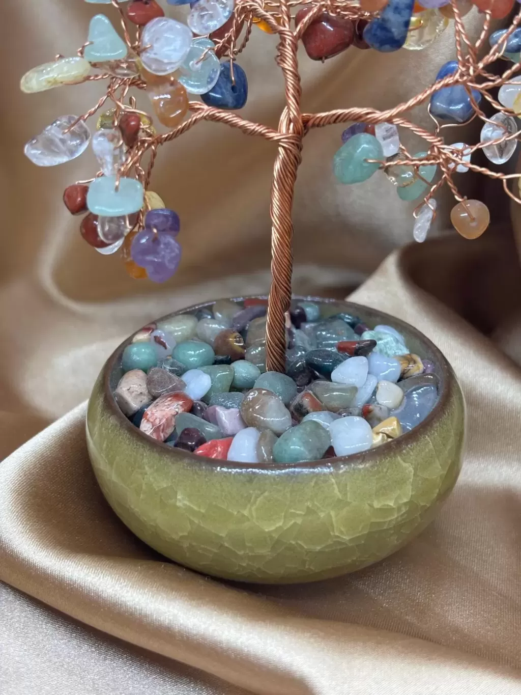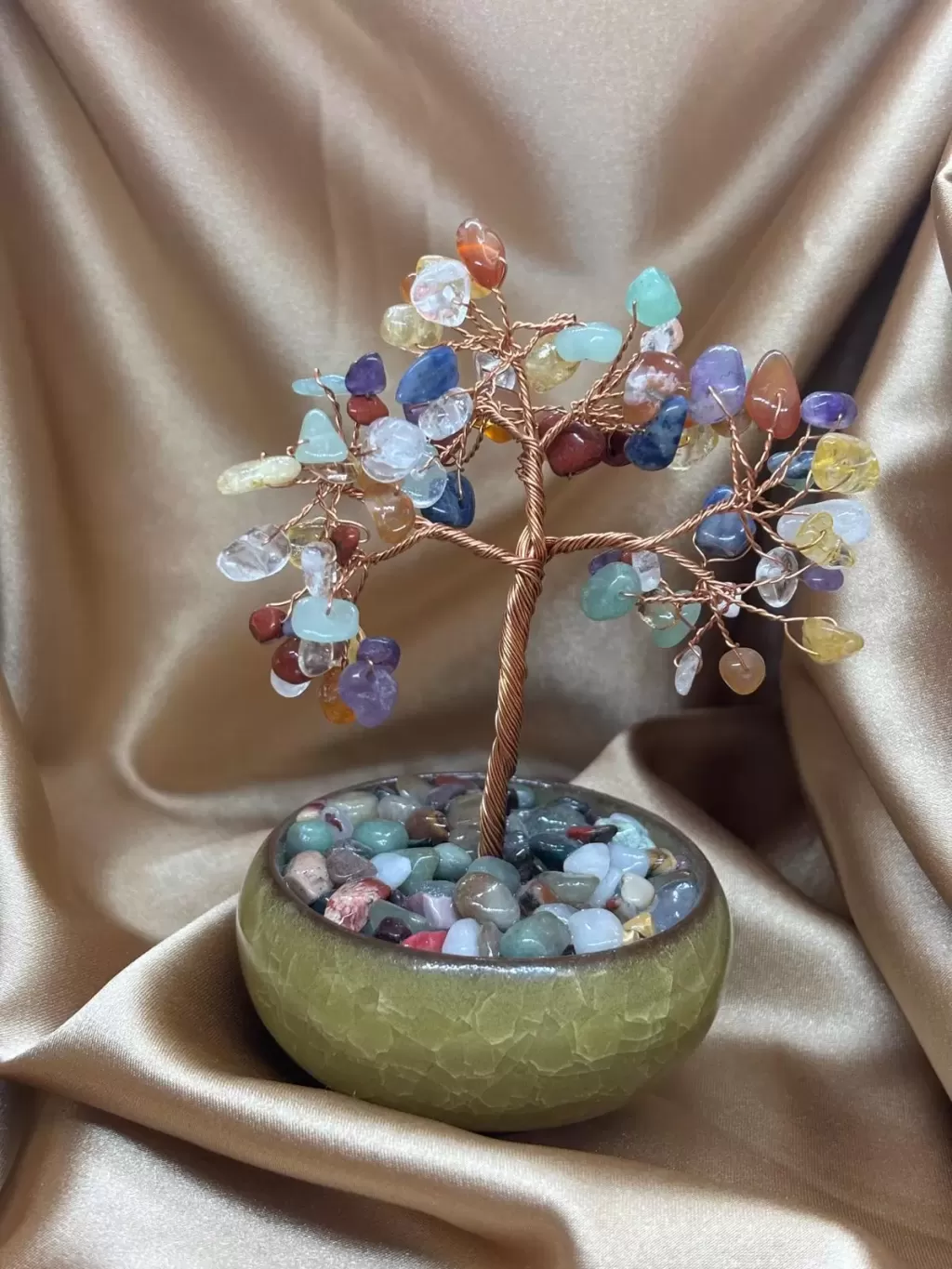7 Çakra Doğal Taş Ağaç Obje; kök çakradan taç çakraya kadar uzanan enerji merkezlerini dengelemeyi destekleyen özel bir spiritüel dekoratif objedir. Doğal taşların bir araya gelmesiyle oluşturulan bu enerji ağacı, yaşam alanında hem estetik hem de titreşimsel bir denge alanı oluşturur.