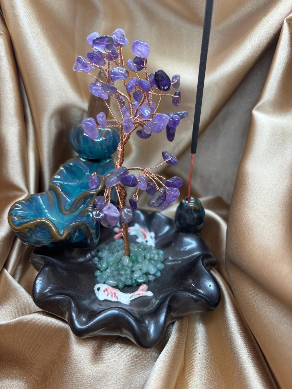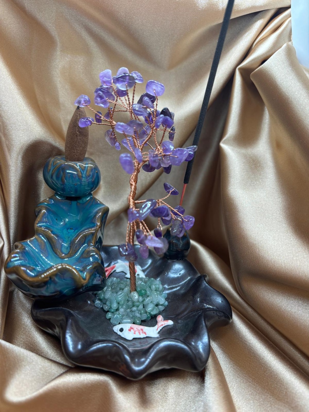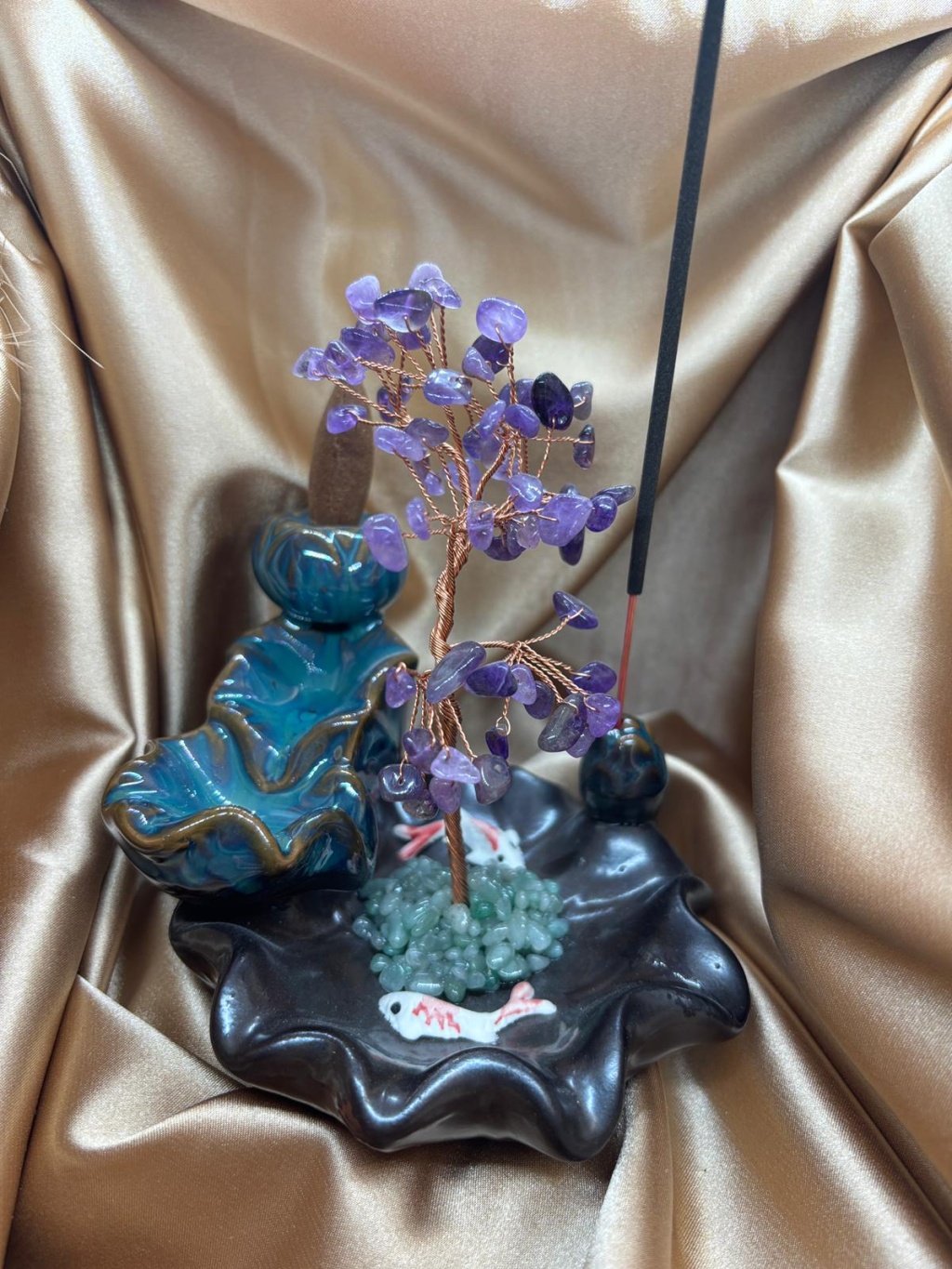 Ametist doğaltaş ağaçlı geri akış ve çubuk tütsülük, yaşam alanlarında enerji temizliği ve ruhsal denge oluşturmak amacıyla tasarlanmış özel bir dekoratif üründür. Ametist taşlarının doğal enerjisi ile tasarlanan ağaç formu, bulunduğu ortama hem estetik bir görünüm hem de dengeli bir enerji alanı kazandırır.