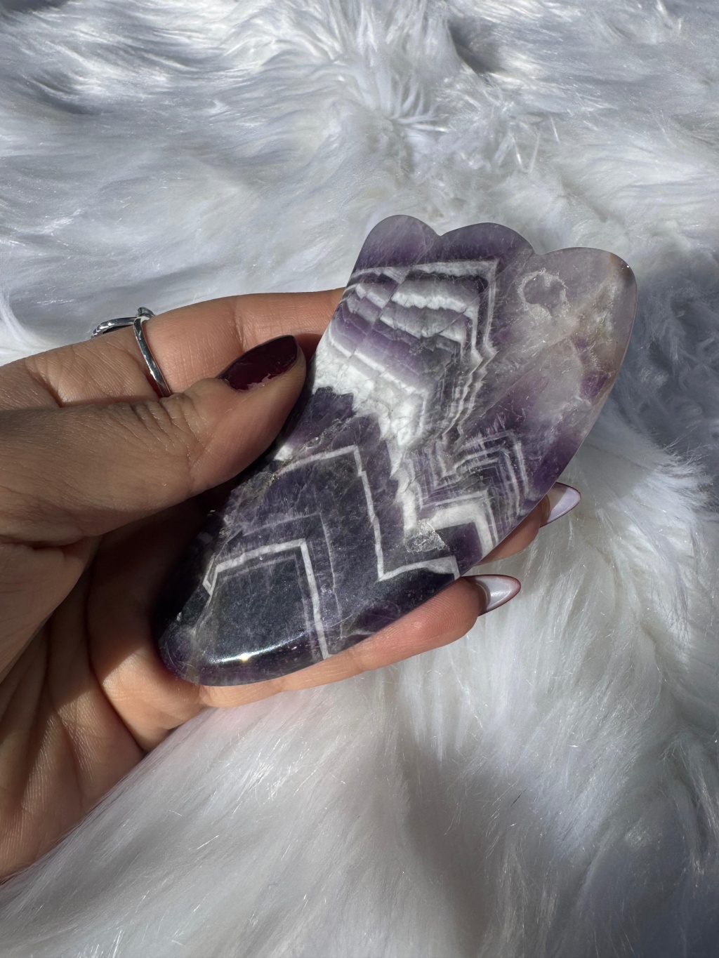 Ürün görselleri temsili olup, doğal taşın yapısı gereği renk tonları, damar yapısı ve formda farklılıklar görülebilir. Her Ametist Gua Sha doğal ve kendine özgüdür.