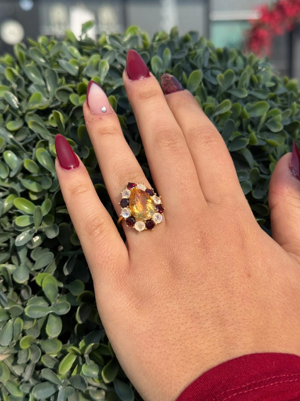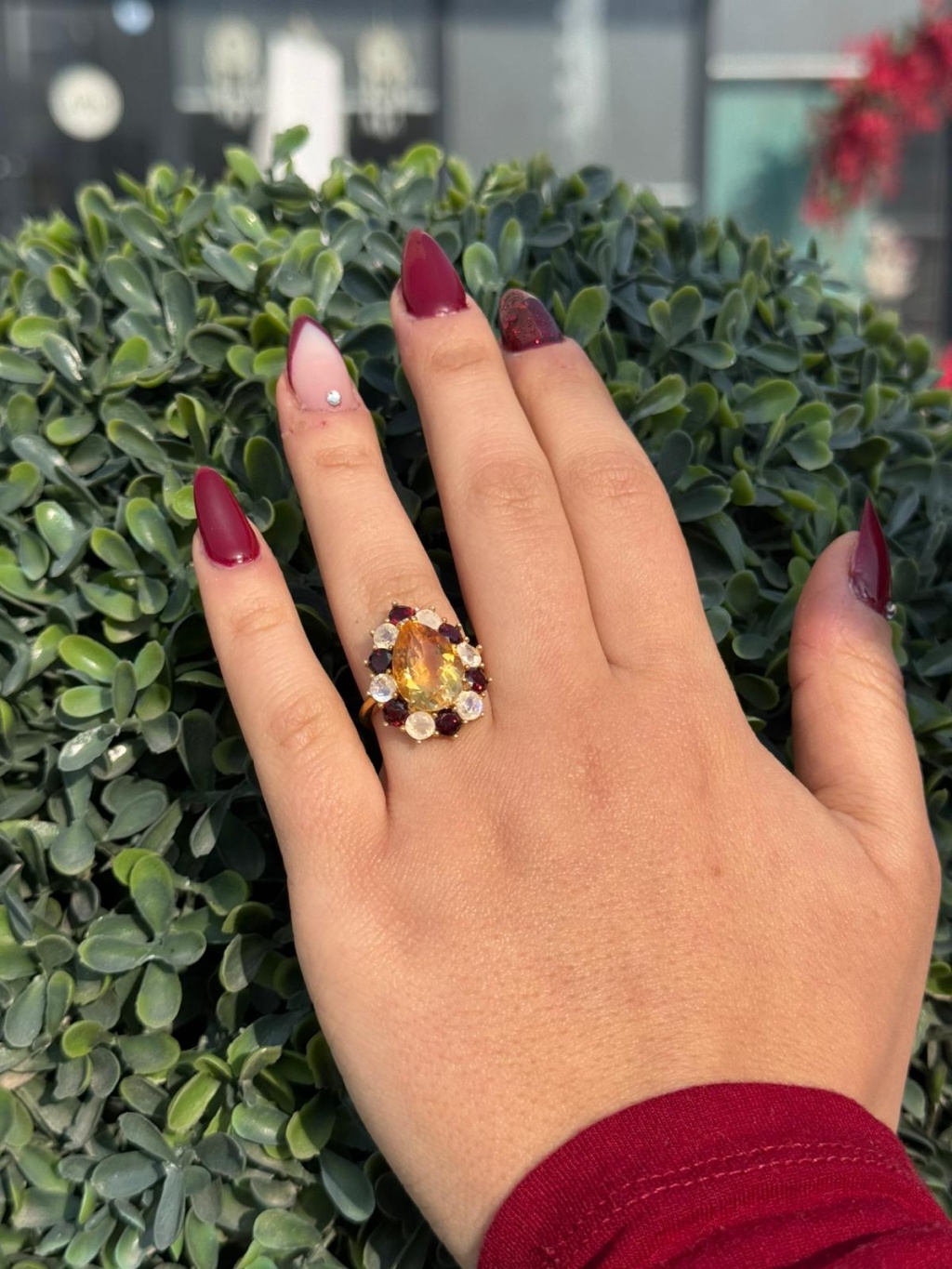Bu özel tasarım yüzükte yer alan ay taşı, sitrin ve garnet taşları; sezgi, bereket ve yaşam gücü temalarını aynı frekansta buluşturur. Günlük kullanımda hem şık bir aksesuar hem de enerji çalışmaları için destekleyici bir takı olarak tercih edilebilir.