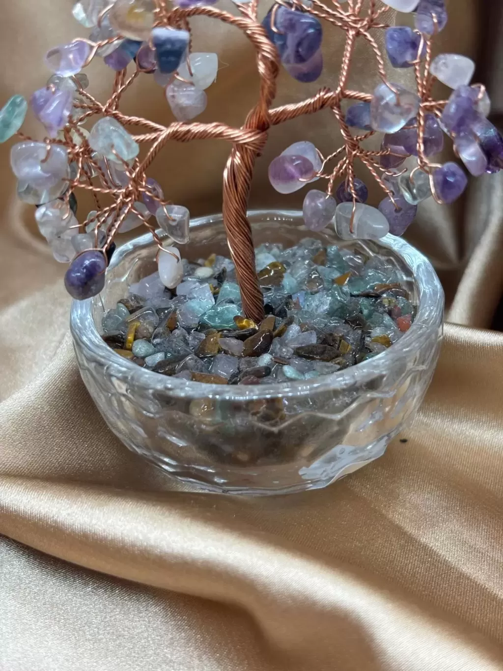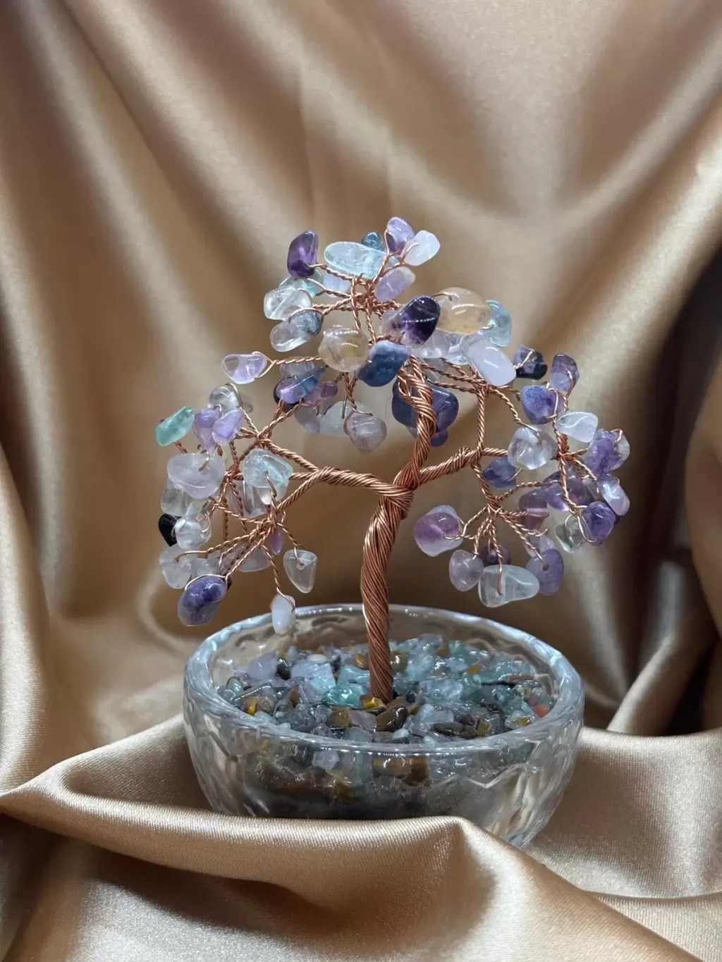 Florit Doğal Taş Ağaç Obje; zihinsel netlik, odaklanma ve enerjisel dengeyi destekleyen özel bir spiritüel dekoratif objedir. Florit taşı, çok renkli yapısı ile farklı frekansları bir arada barındırır ve enerji alanında düzenleyici bir etki oluşturur.