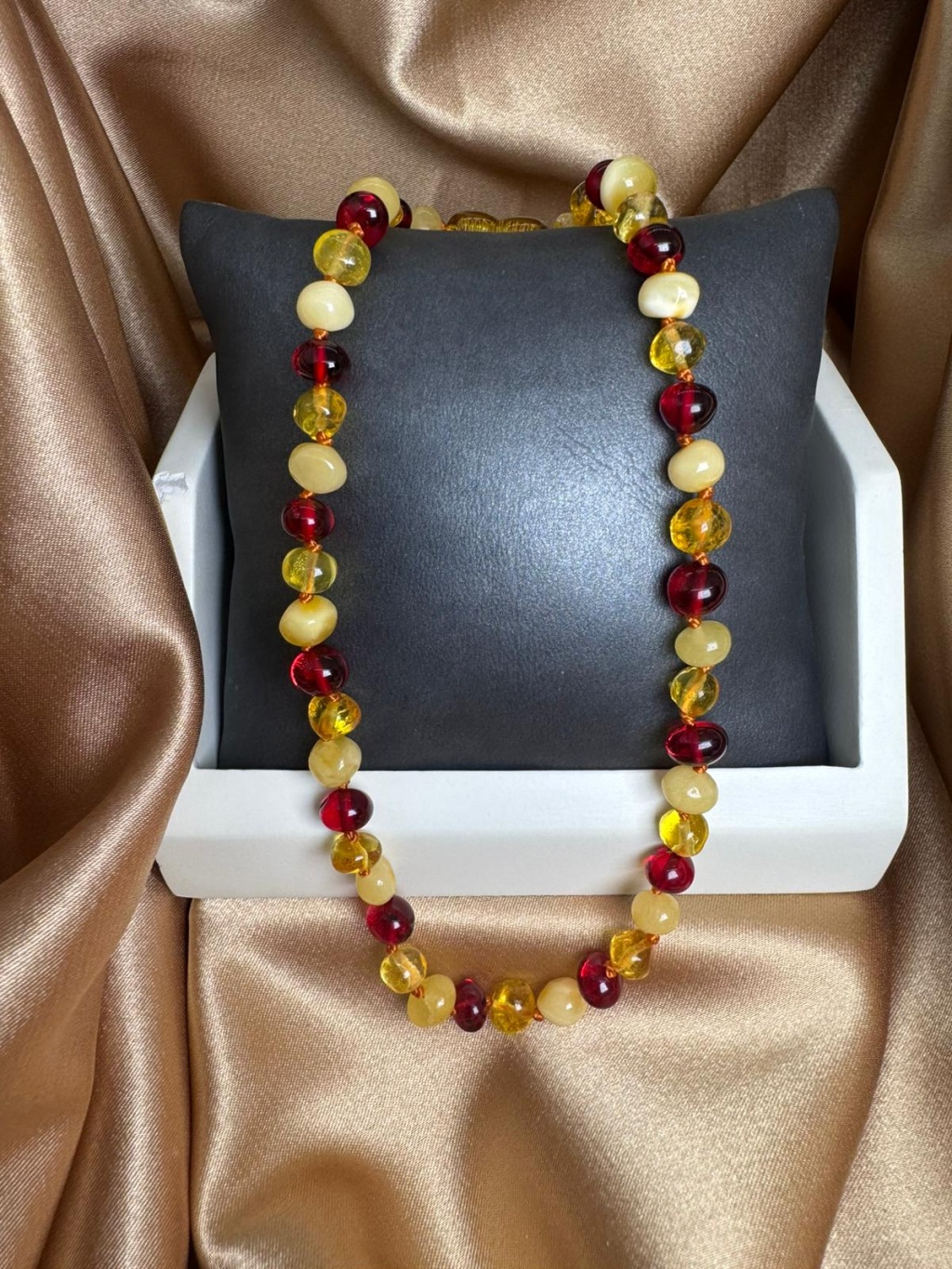 Ürün görseli temsili olup doğal taşların yapısı gereği renk tonlarında, diziliminde ve taş boyutlarında farklılıklar görülebilir. Her kehribar taşı doğanın sunduğu eşsiz bir form ve renge sahiptir. Bu nedenle gönderilen ürün ile görsel arasında ton ve dizilim açısından küçük farklılıklar olabilir.