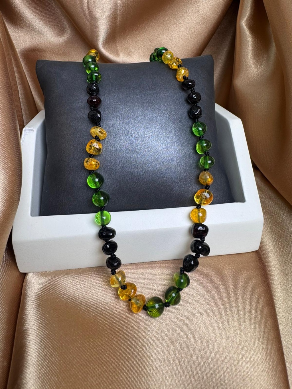 Ürün görseli temsili olup doğal taşların yapısı gereği renk tonlarında, diziliminde ve taş boyutlarında farklılıklar görülebilir. Her kehribar taşı doğanın sunduğu eşsiz bir form ve renge sahiptir. Bu nedenle gönderilen ürün ile görsel arasında ton ve dizilim açısından küçük farklılıklar olabilir.