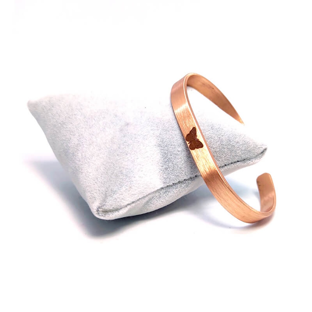 Kelebek Model Bakır Bileklik, dönüşümün, yenilenmenin ve özgürleşmenin sembolü olan kelebek figürü ile bakırın doğal enerjisini bir araya getiren zarif ve anlamlı bir tasarımdır. El işçiliğiyle hazırlanmış bu sade bakır bileklik, minimal görünümünün yanı sıra sembolik anlamı ile de öne çıkar.