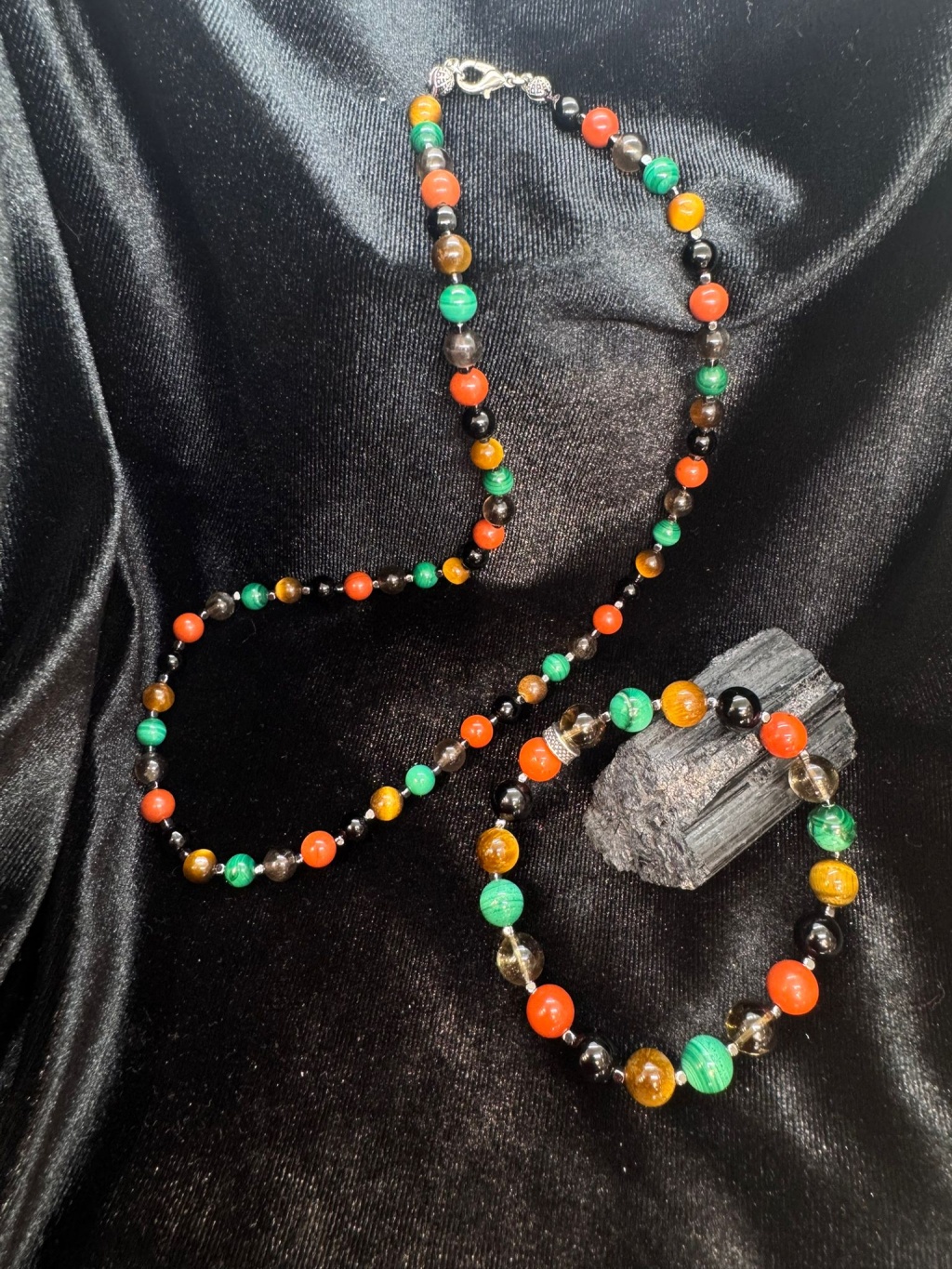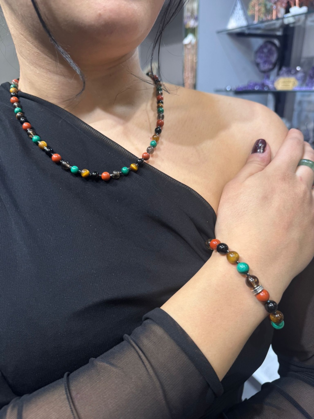 Oğlak Burcu Doğaltaş Bileklikve Kolye, Oğlak burcunun disiplinli, kararlı ve hedef odaklı yapısına uyum sağlayacak şekilde seçilmiş doğal taşlardan hazırlanmıştır. Bu bileklikve kolye; topraklanma, içsel güçlenme, enerji dengesi ve aura korumasını desteklemek amacıyla tasarlanmıştır.