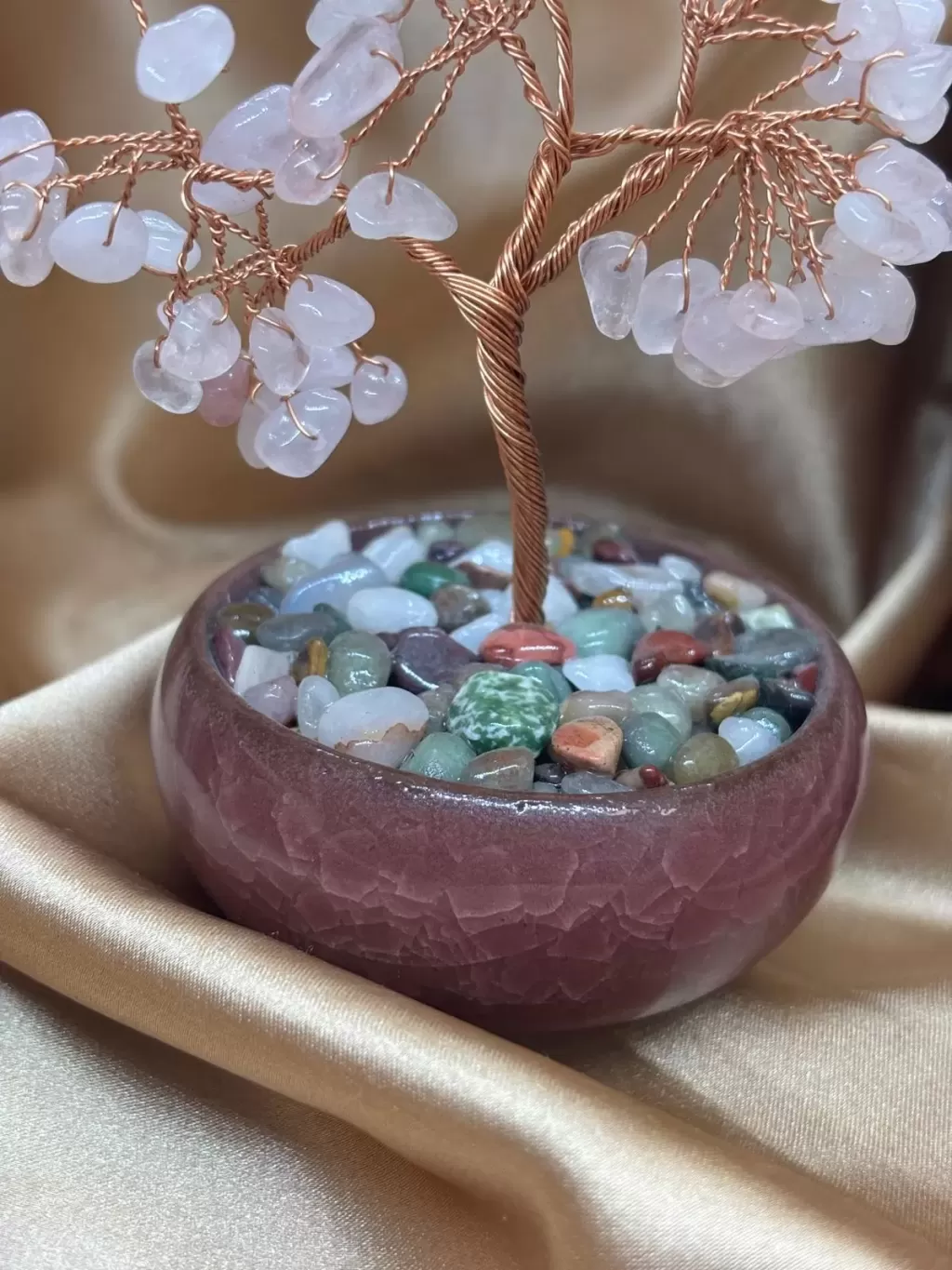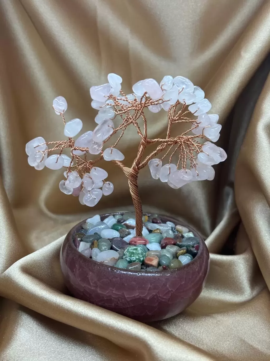 Pembe Kuvars Doğal Taş Ağaç Obje; sevgi, şefkat ve duygusal denge enerjisini yaşam alanınıza taşıyan özel bir spiritüel dekoratif objedir. Pembe Kuvars taşı, kalp çakrası ile güçlü bir rezonans kurar ve koşulsuz sevgi frekansını temsil eder.