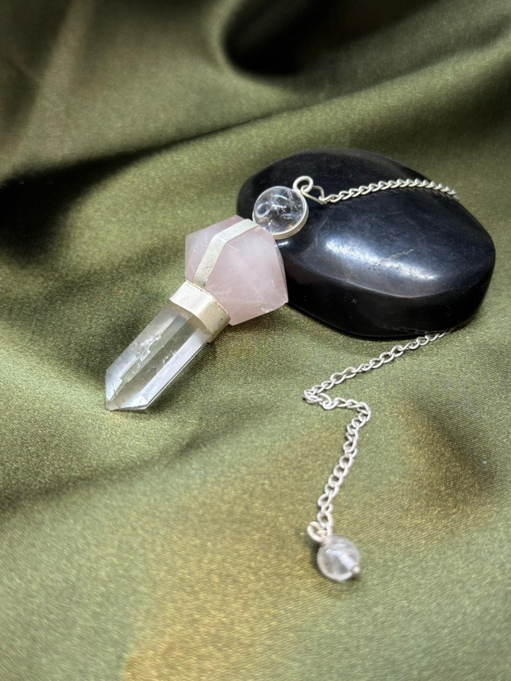Pandül çalışmaları sırasında bu iki taşın birleşimi; duygusal alanın daha net algılanmasına, kalp merkezli konularda sezgisel farkındalığın artmasına ve enerji okumalarının daha dengeli yapılmasına yardımcı olur. Pembe kuvars, duygusal yoğunluğu yumuşatırken; kristal kuvars, alınan bilgilerin berraklaşmasını destekler. Bu yönüyle özellikle ilişkiler, özdeğer, sevgi ve duygusal şifa temalı çalışmalar için tercih edilir.