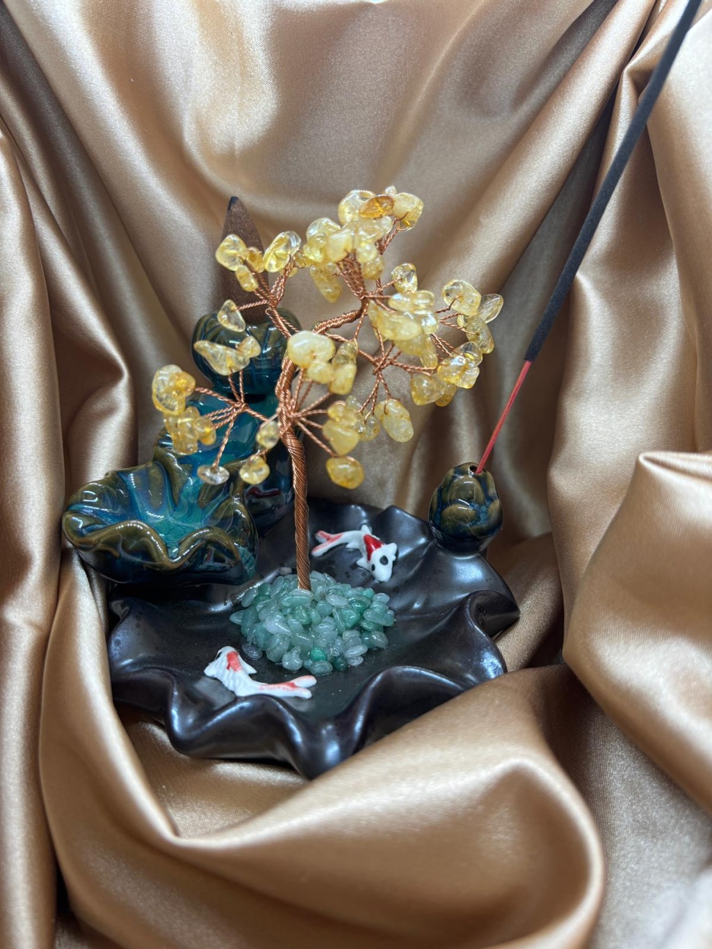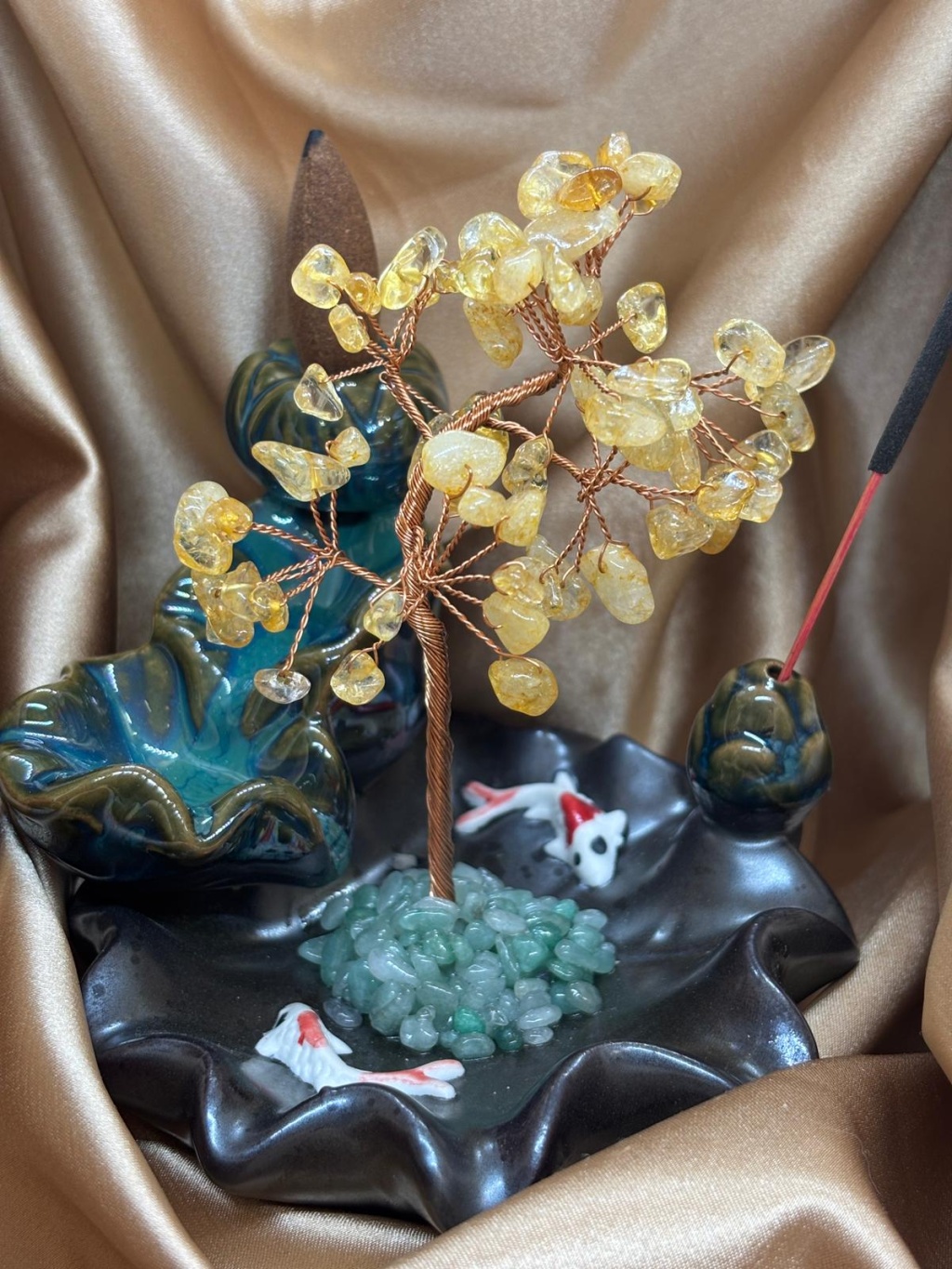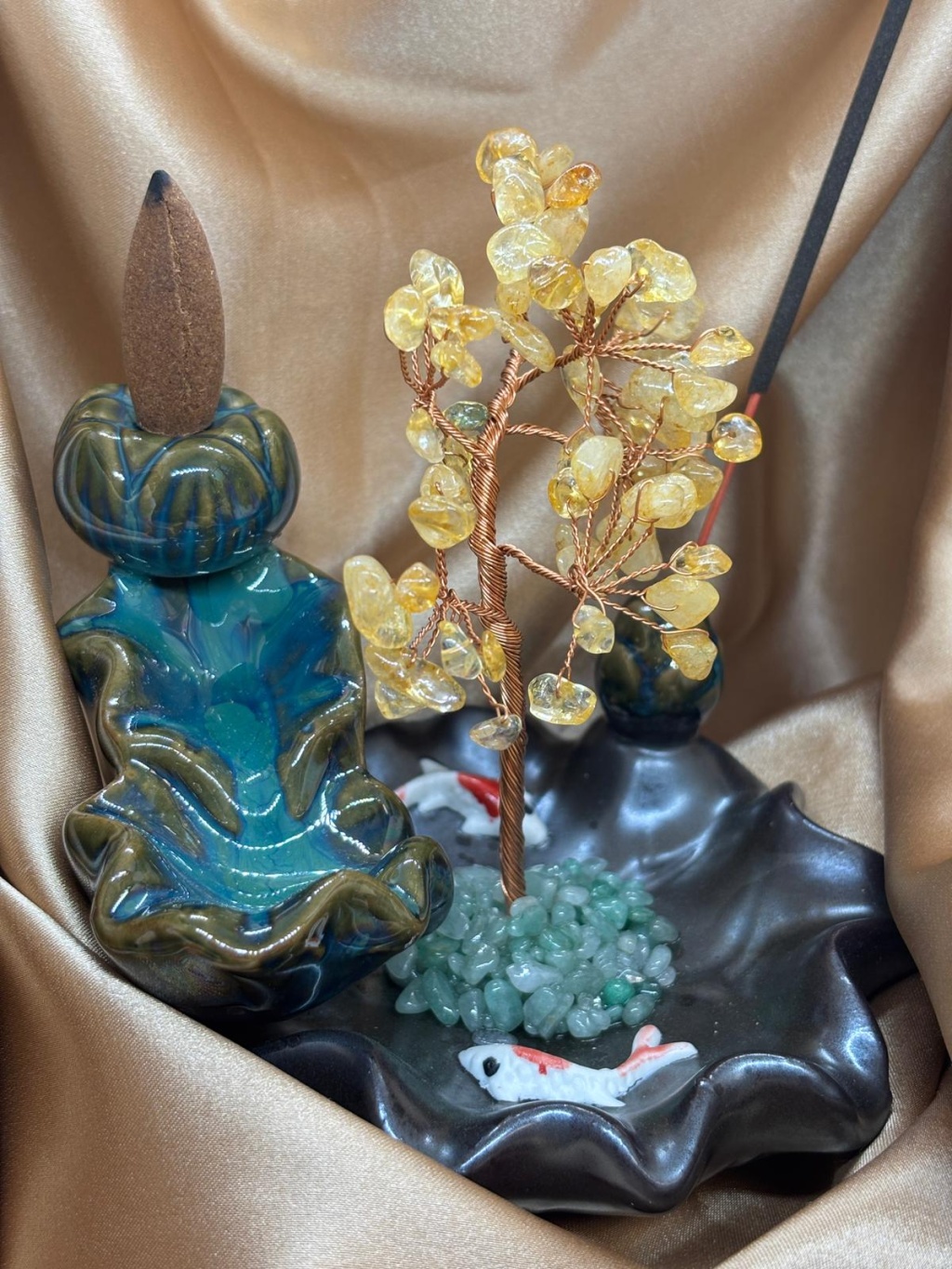 Sitrin doğaltaş ağaçlı geri akış ve çubuk tütsülük, yaşam alanlarında hem estetik hem de enerjisel denge oluşturmak amacıyla tasarlanmış özel bir dekoratif üründür. Sitrin taşlarının doğal enerjisi ile oluşturulan ağaç formu, bulunduğu ortama canlılık ve pozitif bir frekans kazandırırken tütsü kullanımına uygun tasarımı ile fonksiyonel bir kullanım sunar.