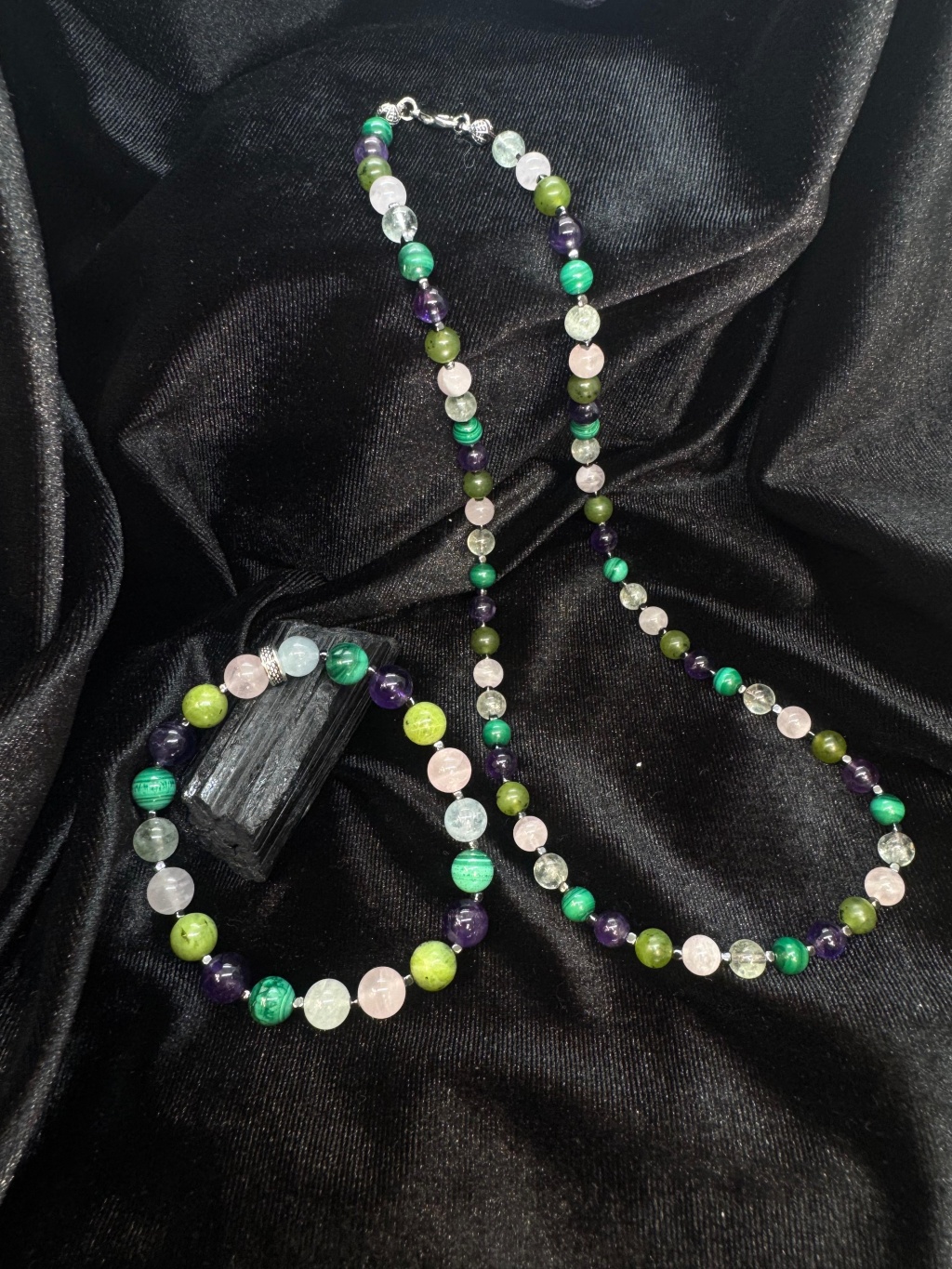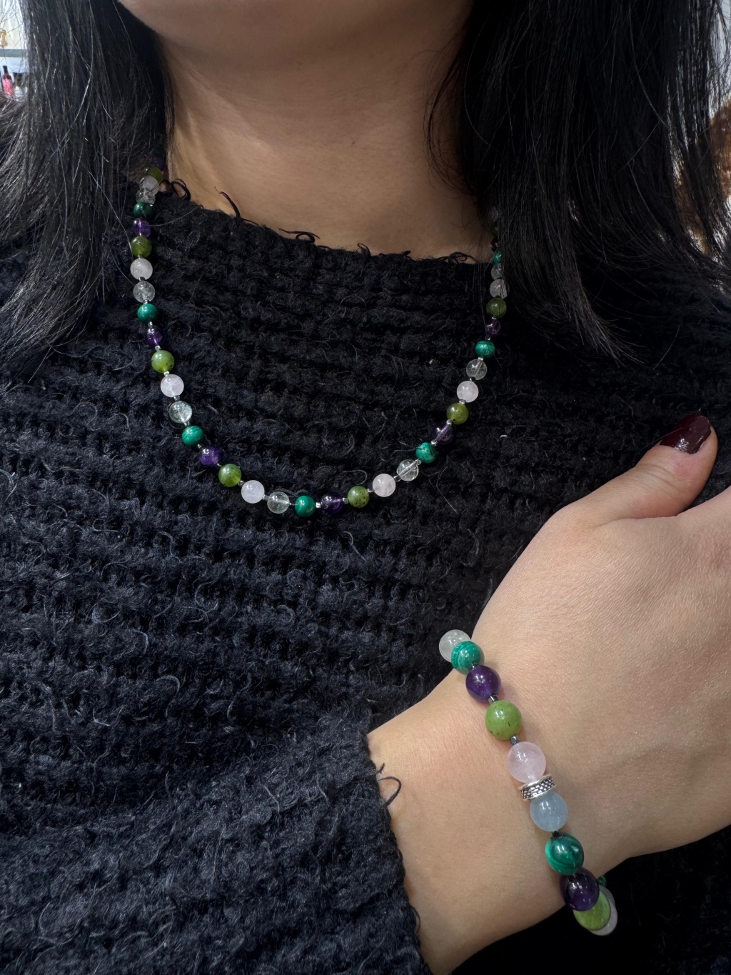 Bu bileklik ve kolye özellikle kalp çakrası, üçüncü göz çakrası ve taç çakra üzerinde çalışarak Terazi burcunun duygusal dengesini ve aura uyumunu desteklemeyi amaçlar. Sevgi enerjisinin daha dengeli akmasına ve ilişkilerde uyumun güçlenmesine yardımcı olur.